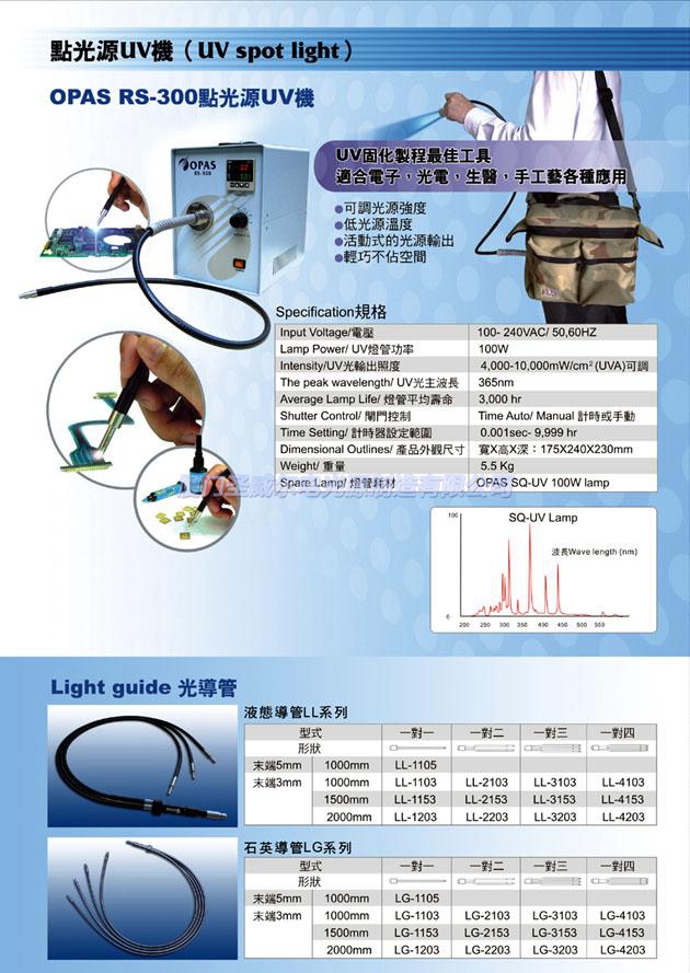 OPAS XLite300點(diǎn)光源UV機(jī),能夠?qū)ⅲ眨止庠淳劢?,形成一個(gè)照度很強(qiáng)的光點(diǎn)。藉由光導(dǎo)管的傳導(dǎo),能夠?qū)⒐庠磦鬏數(shù)侥康牡厝?。除了發(fā)散出紫外線之外,XLite300也發(fā)散可見(jiàn)光及紅外線。但是大部分的紅外線都被特殊處理的反射罩,往燈泡后方排出。因?yàn)檫@個(gè)原因,經(jīng)由XLite300光導(dǎo)管導(dǎo)出的的光源,具有低溫的特點(diǎn)。XLite300廣泛應(yīng)用于UV樹(shù)脂的固化。當(dāng)UV樹(shù)脂吸收到XLite300光源時(shí),通常能夠在數(shù)秒內(nèi)完成聚合反應(yīng)。非常適合接著,固定,封裝等用途。