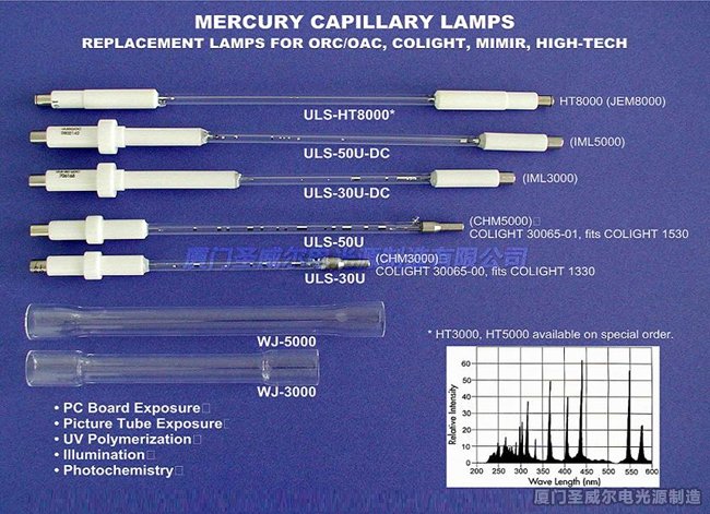 主波峰在313 nm-480 nm之間,規(guī)格有30多個(gè)品種,該燈是一種水冷及瞬間點(diǎn)亮的燈型,其主要特點(diǎn)為瞬間啟動(dòng),功率密度高,水冷卻溫度低,主要應(yīng)用在UV固化,曝光,制版,光化學(xué)反應(yīng)及印刷線路板工業(yè).我們有適用于各種設(shè)備的燈型,品質(zhì)上乘,能滿足業(yè)界的最高技術(shù)與品質(zhì)要求.